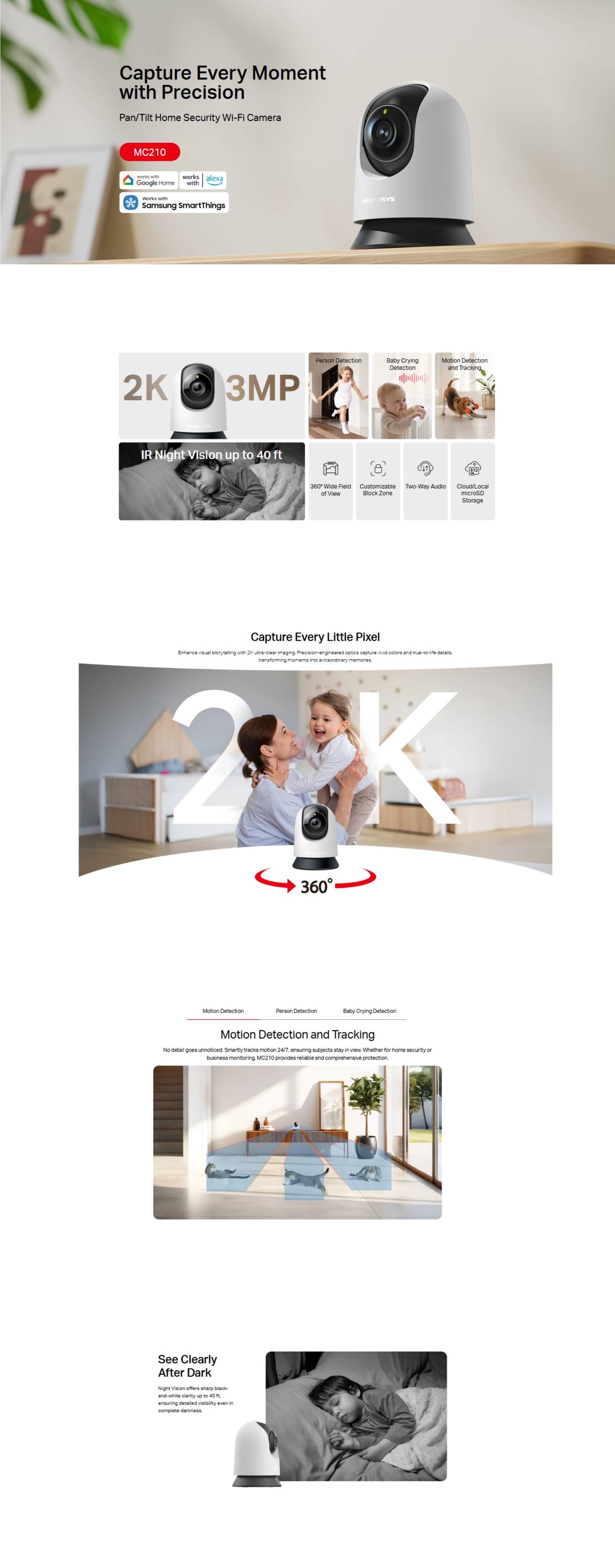 With night vision up to 40 ft, two-way audio, local storage up to 512GB microSD, cloud support, customizable privacy zones, and voice control via Alexa & Google Assistant, the MC210 offers reliable and smart home monitoring for babies, pets, and everyday security.